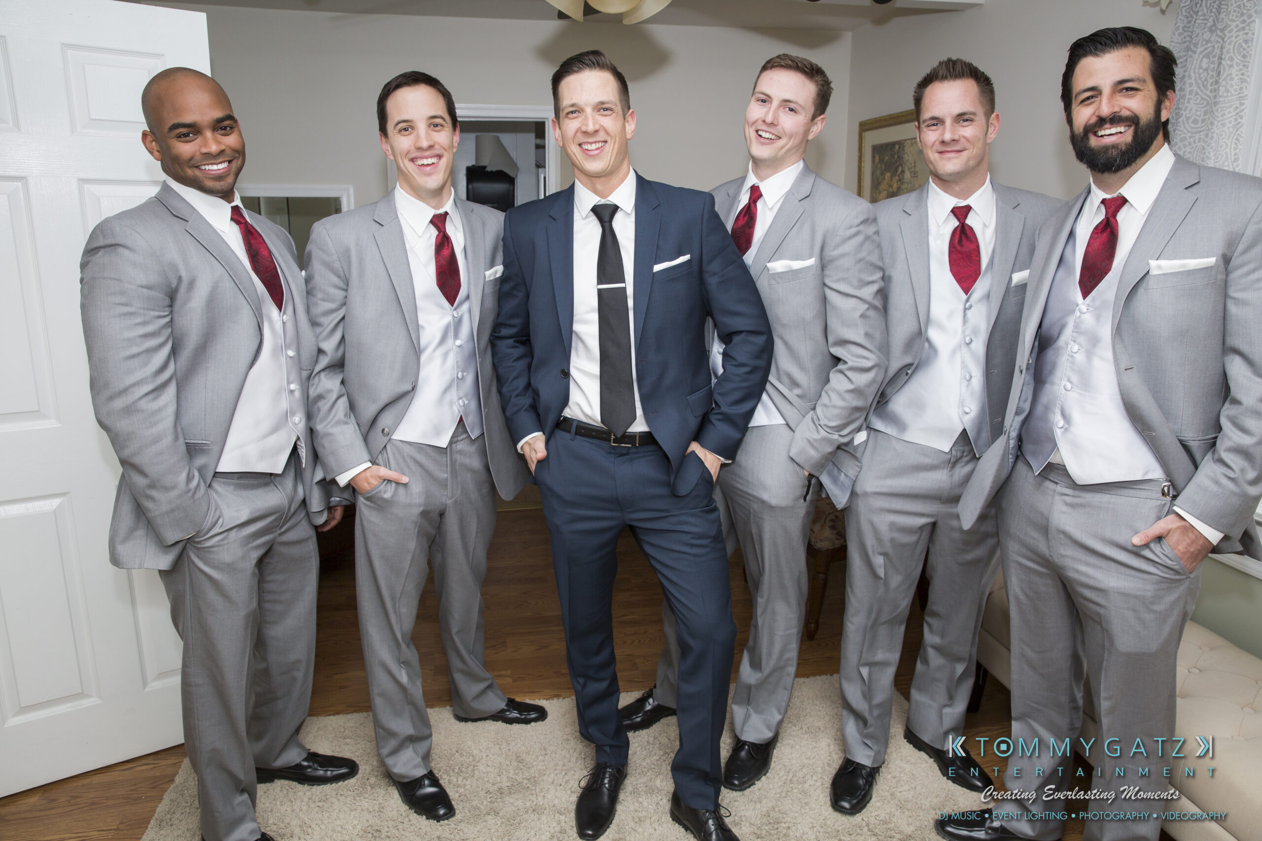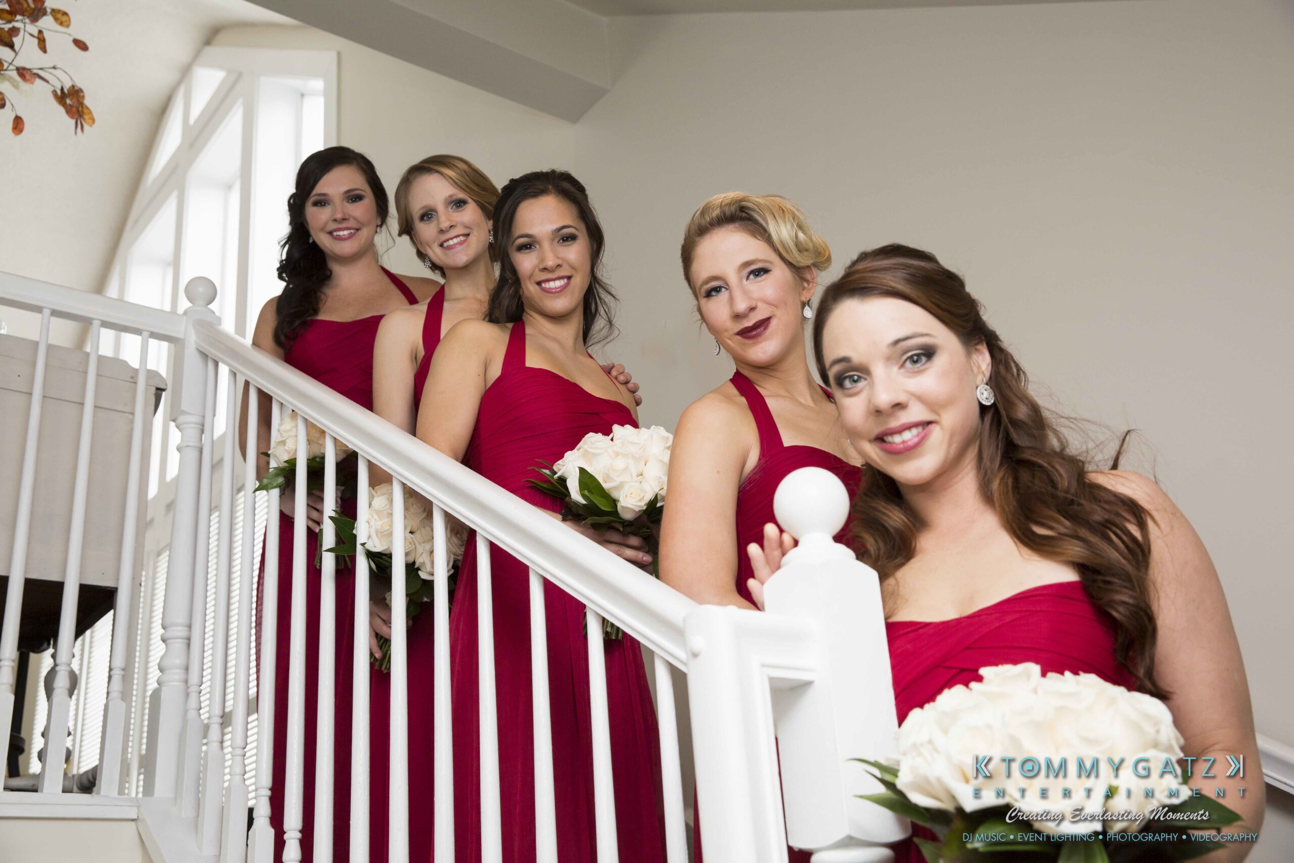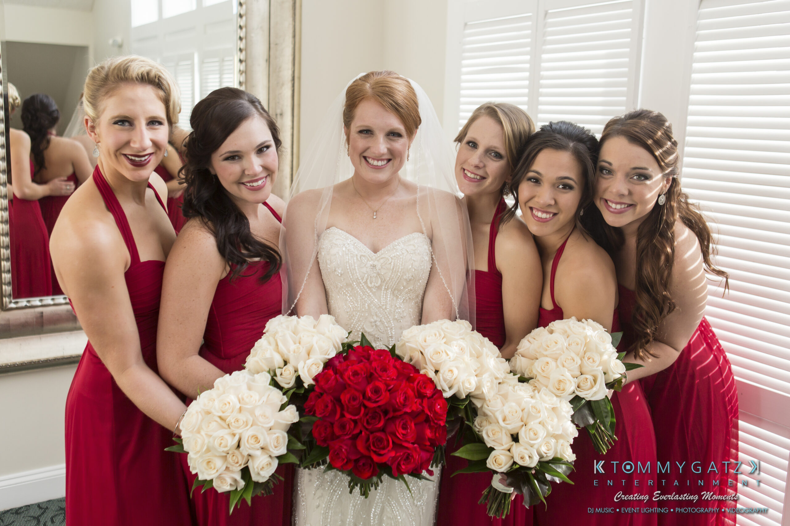 Classically perfect red roses made up Erika’s bouquet and were a theme throughout the celebration. Her wedding dress was adorned with gorgeous beading– simple yet elegant. Michael opted for a blue suit with a black tie and looked very dapper in it. The bridesmaids wore red halter gowns that were stunning on each of them. The red dresses matched the groomsmen, who wore red ties and gray suits.
